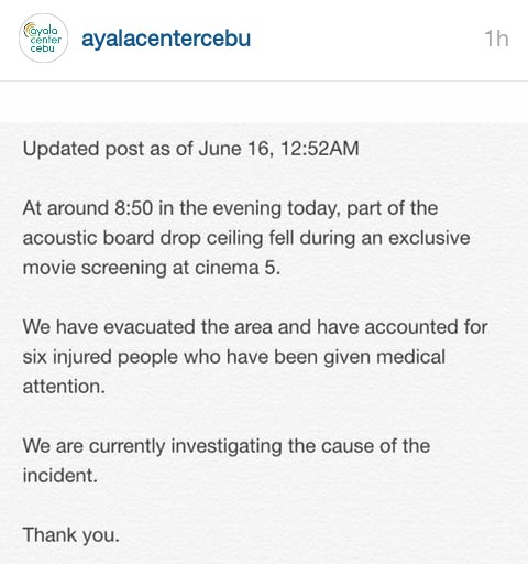 Last night, June 15, 2015, the Ayala Center Cebu Cinema 5 was rented exclusively by a private company for a movie screening. Few hours later, water from the ceiling began to pour leading everyone to leave the center area.